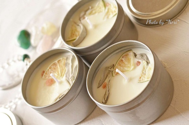 セージと浄化系アロマ精油を使用したソイキャンドルです。 大豆ワックスは空間浄化にもなりススが出にくい天然素材。そこへセージの精油や浄化にマッチした精油を配合しています。 ゆっくりと灯る自然派キャンドル。灯りをじっと見ていると不思議と穏やかな気持ちに…。 柔らかな乳白色と穏やかな香り、炎のゆらぎが五感を癒します。 人工香料は一切使用していないので変に香りが残りません。 ホワイトセージの葉とヒマラヤ岩塩のホワイトをちりばめました。 ※ご希望があれば「ウッド木の芯」で作る事も可能です※ 【キャンドル内容】全体容量80g直径8㎝×高さ4㎝の丸アルミ缶蓋つき。 (大豆ソイワックス90% / 蜜蝋10% / ホワイトセージ・ミント・フランキンセンス5%濃度) 芯は糸芯ですが希望により木芯を使うこともできます。 燃焼時間はトータル約20時間程度です ※火の取り扱いにはお気をつけてください。 ※冬場の作品には多少の収縮が見られます。(製品に問題はありません) ※ソイワックスはデリケートなので、多少ひび割れが見られる時があります。