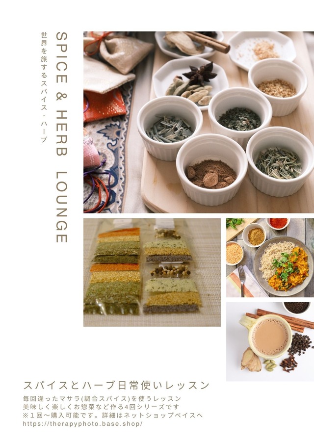 【1回分の基本料金が表示されています】 世界各地のスパイスとハーブの魅力を知り、実際にお惣菜など作る体験型オンラインレッスン。日々のお惣菜がスパイスとハーブでおしゃれに。 講座ほど堅苦しくなく、お喋りしながら食べながらの「ラウンジ」という雰囲気で一緒にワークしましょう。 毎月違うスパイスやハーブのマサラ(調合キット)をお送りし、オンラインZoom90分で知識を深め体験していく4回シリーズです。申込み人数により、個人かグループレッスンか変わります。 お申込みの際には、ご連絡が付くメールアドレスかLineをお知らせください。 4回でスパイスハーブの楽しさが深まりますが、1回の単発レッスンのご購入も出来ます。 ※複数回まとめてご購入頂くと割引となります。オプション回数券に表示されている金額が基本料金に加算されます。欠席の場合は、アーカイブ動画がご覧になれます。 【内容】 前半20分でスパイスの基礎知識を学び、後半50分では実際にスパイスを使った料理のワークを行います。最後には、実食の感想をシェアしながらのひとときを楽しむ、合計90分の充実したレッスンです。 スパイスの知識・座学を前半20分 スパイスを使ったワークを後半50分 残りの時間で実食したり感想をシェア 合計90分 【毎月の日時】実施日の一週間前で申込を〆切ます 毎月第三火曜日の10:30~、第三土曜日の20:00~ 【内容詳細】 第一回 5月 ターメリックやカルダモン、基本のインドスパイスカレー 第二回 6月 シナモンやクローブ、ほっとするチャイティ(スパイスミルクティ) 第三回 7月 レモングラスやコリアンダー、爽やかなタイ風カレー 第四回 8月 カレーリーフやペパーミント、中東ヨーロッパ風のお惣菜