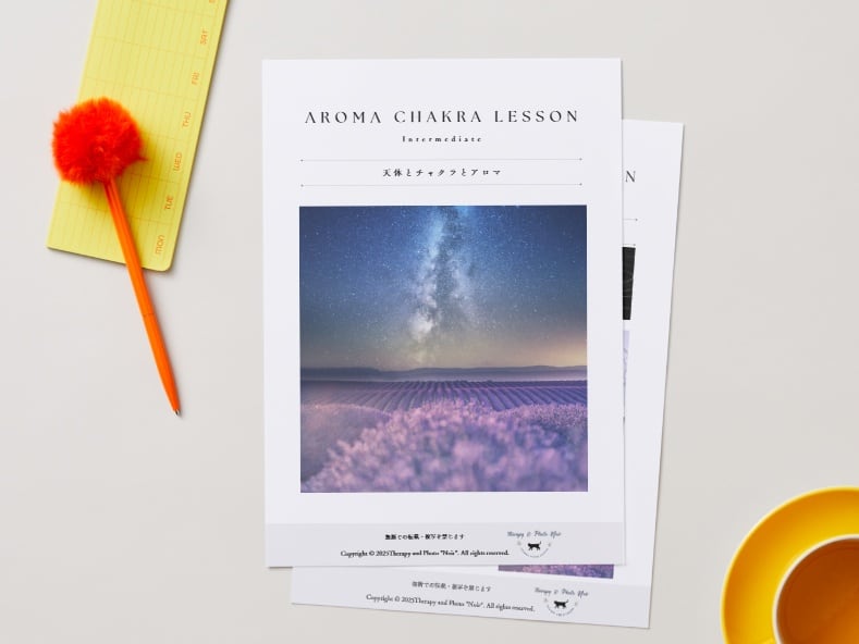 ─中級では各アロマ精油の周波数と自然界に存在する様々な周波数との関わり、人体と天体と気質と体質の関わりを見てゆきます。専門的な分野になってきますので、アロマ精油の基礎知識がない方はご遠慮頂いております。